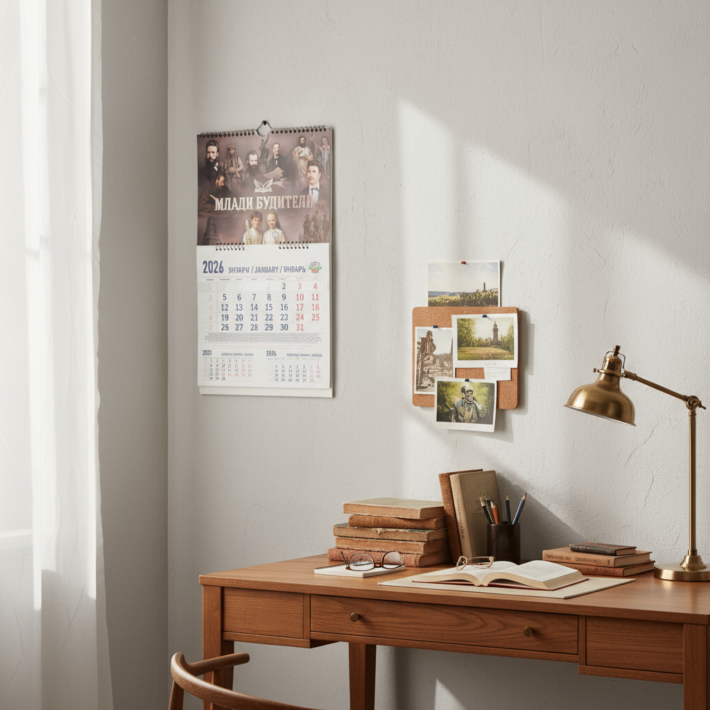 Стенен календар за цялата календарна година 2026, вдъхновен от колекцията „Млади Будители“. В горната част е изобразен оригиналният арт „Младите будители“ – символ на българския дух, знание и родолюбие.